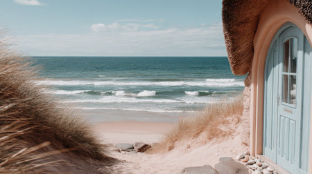This tranquil scene captures a beach cottage overlooking the vast ocean. Soft sunlight illuminates the sandy beach and the gentle waves. The composition focuses on natural elements, featuring a clear sky and beach grass. It could be used for travel, tourism, or lifestyle content.