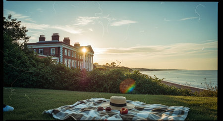 seaside bed and breakfast with sunset, created with generative ai