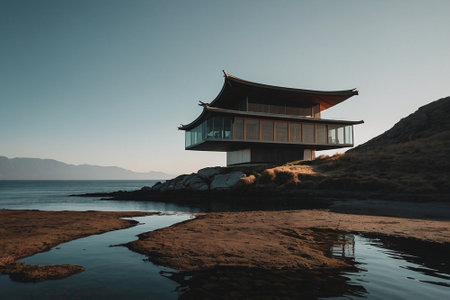 Overlooking a serene ocean, a sleek beachfront residence blends seamlessly into the rocky terrain. The sun sets, casting a warm glow on the modern architecture surrounded by lush greenery.