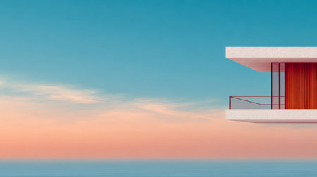 A sleek modern house features a balcony that provides a stunning view of the ocean at sunset. The sky is painted in hues of orange and blue, creating a serene backdrop.