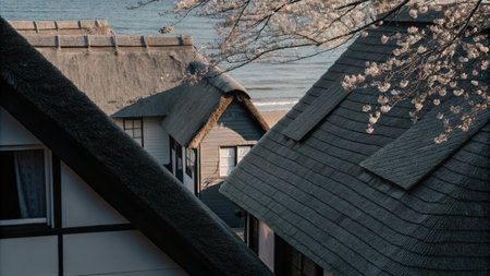 Traditional houses with thatched roofs and springtime blossoms