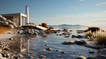 A lonely cottage on a ridge of land on the coast. Ai generated.