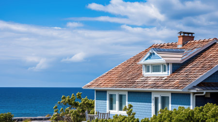 cape cod house exterior, with view of the beach and ocean in the distance, created with generative ai