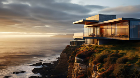 A house on a hill overlooking the ocean. AI generative image.