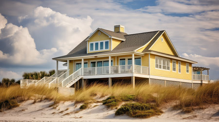A large house with a porch sits atop a dune overlooking the ocean. The exterior features white trim and a dark gray roof. The composition showcases natural elements: grasses, sand, and the sea under a moody, overcast sky. This image can be used for real estate, vacation, or travel themes.