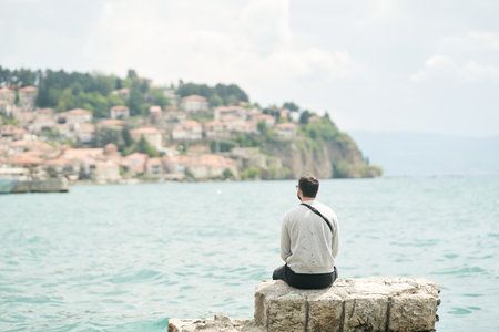 A young man admires Lake Ohrid. View from the back