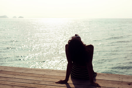 Young sexy woman relaxing alone on the pier near the sea and waiting for somebody in ocean