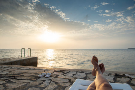 Feet watching the sunset on the sea. The beautiful world of Mediterranean countries