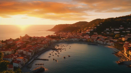 Aerial view of a serene tropical village by the beach bathed in golden sunset light