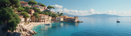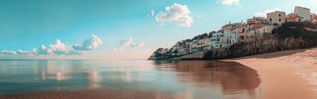 A serene coastal village background with charming houses, calm waters, and the textures of sandy beaches and gentle waves, creating a peaceful and idyllic coastal setting.