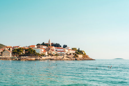 Cityscape of Primosten peninsula and clear blue sky and sea. Croatia, Primosten.