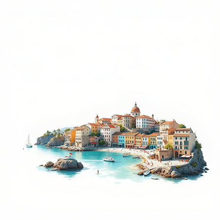 A captivating view of a colorful village perched on rocky cliffs by the sea, showcasing stunning architecture and serene water, perfect for travel enthusiasts.