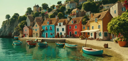 A small village with boats along the shoreline, A charming fishing village nestled along the shoreline