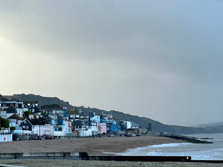 View of the beach and buildings on a cloudy day in Lyme Regis Dorset England .
