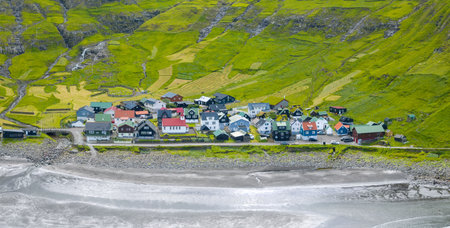 Aerial view of the Tjornuvik village and its beach located at a beautiful bay in the Faroe Islands, Denmark.