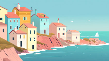 Vector landscape of a coastal village with colorful houses, blue ocean, and a clear sky, simple color palette with flat colors, minimalist and charming, Digital Art, created using vector graphics, --ar 16:9 Job ID: 83e5c913-f889-4a66-be87-2c49b6079182