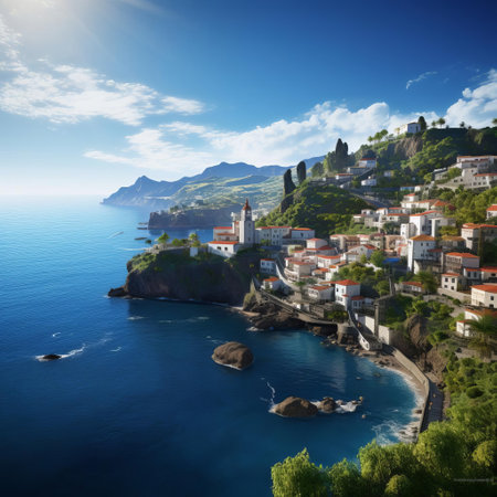 A picturesque view of a coastal village featuring vibrant buildings, abundant greenery, and the sparkling sea.