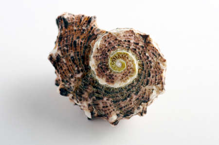 white with brown spots seashell with spiral, macro, close-up, isolate on a white background