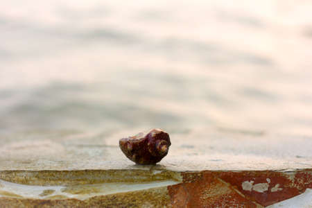 Seashell in the Beach rock on the background of beach and sea - (shallow DOF). Beach with conch seashell under blue sky at sunrise. Single shell on beach seascape.