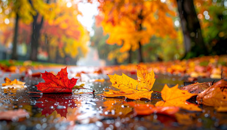 Close-up of red and yellow maple leaves on a wet asphalt road with visible raindrops and reflections, set against a blurred backdrop of autumn trees.