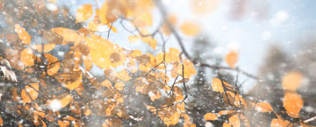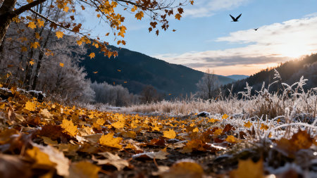 Autumn landscape with yellow leaves and hoarfrost in the mountains