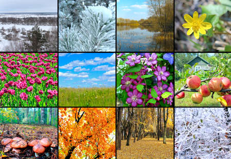 Natural collage of landscapes by season, four seasons of the year. The concept of changing seasons. Beautiful winter, summer, autumn and spring landscape. Russian landscape