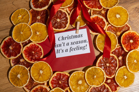 Christmas handmade wreath made of dried slices of orange and grapefruit with red envelope and paper note with CHRISTMAS ISNT A SEASON ITS A FEELING text. Winter holiday celebration greeting card