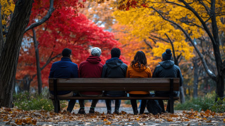 Group of people sitting on a bench in the park in autumn.