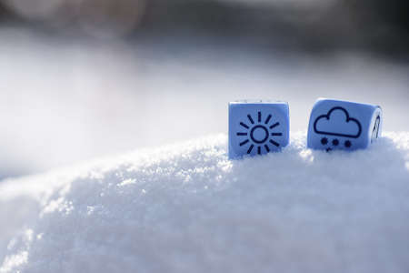 concept of winter weather, dice with clouds and snow lying on snow - stock photo