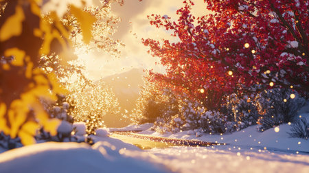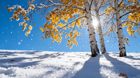 A picturesque winter landscape featuring fresh snow covering the ground and vibrant leaves on trees, illuminated by soft sunlight in a tranquil setting.
