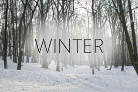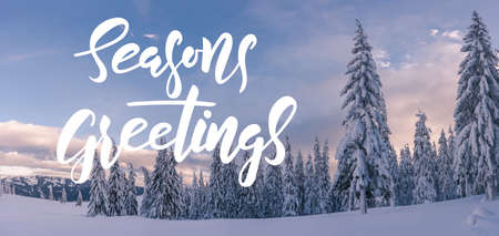 Landscape with winter day in woodland and hand lettering text Seasons greetings. All trees covered with white snow. Beautiful christmas wood