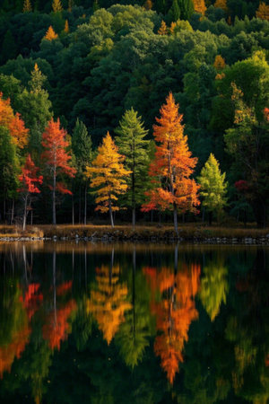Colorful tree reflections on the shores of the autumn forest lake