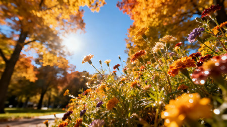 Colorful autumn flowers in the park with sunbeams and lens flare
