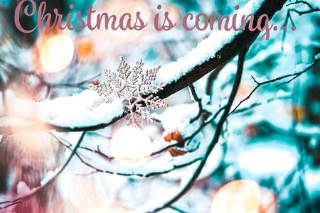 Golden Christmas Decoration snowflake Hanging Outside On A Frosty Tree Branch with bokeh fairy lights. Vertical format.