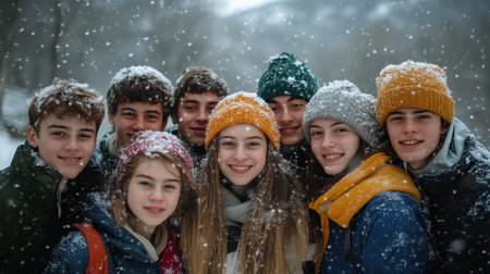 Group of friends smiling together in a snowy landscape during winter in a forest