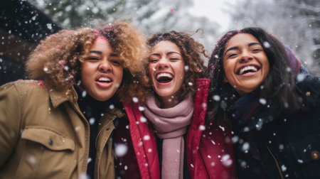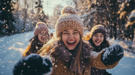 Joyful friends playing in the snow during a sunny winter afternoon in a serene forest landscape