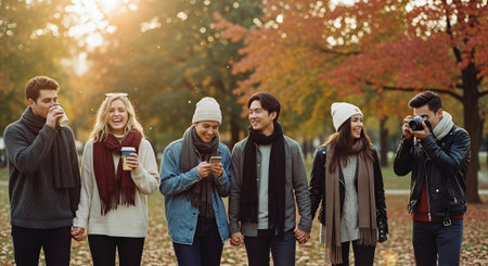 A group of friends walking in a park during autumn, wearing warm clothing and scarves, enjoying coffee and taking photos, surrounded by colorful fall foliage