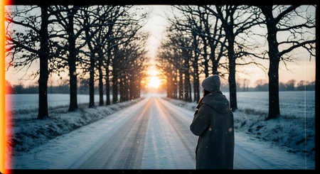 Young woman in winter clothes standing on the road and looking at the sunset