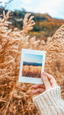 Autumn memories captured in instant film with field background.
