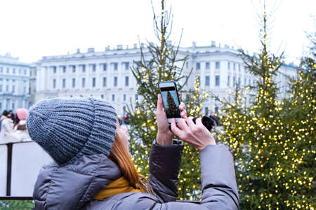 Unrecognizable woman taking a photo of a Christmas tree on a mobile phone. People from behind.