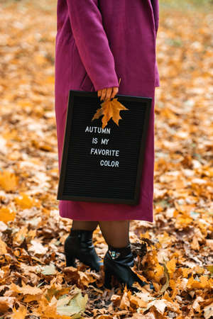 Hello autumn. Faceless outdoor portrait of woman with Letter message board with text Autumn is my favorite color