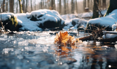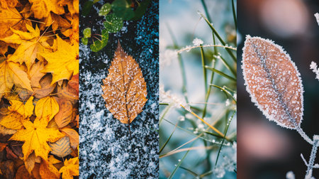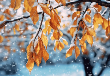 Generative AI : Frozen autumn leaves seasonal vintage winter background macro image