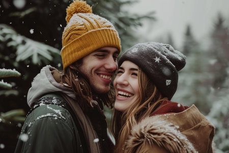 A happy young couple in winter attire smiling amidst a charming snowy landscape