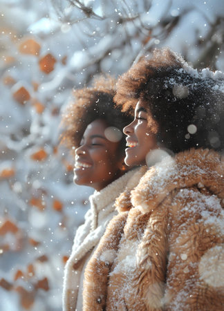 Two friends stand side by side in a snowy landscape, smiling and enjoying the winter weather. Fluffy coats and snowflakes create a picturesque setting of joy.