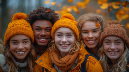 Portrait of a group of smiling multiethnic friends standing in autumn park