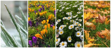 Seasons showing collage of four distinct seasons showing spring blossoms summer beach autumn foliage and winter snow...
