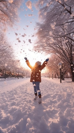 Generative AI : happy child girl throws up snow on a winter walk