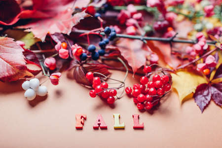 Fall writing word arranged by autumn leaves and red blue berries. Seasonal decoration.