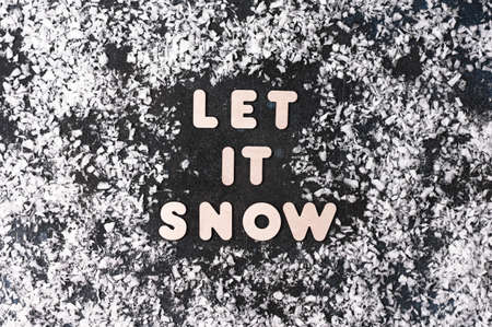 Text let it snow on dark background with snowflakes, winter time. Flat lay. Christmas, new year concept.