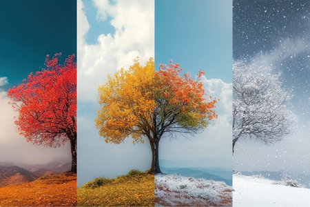 Four side-by-side trees represent the seasons. Autumn is shown with red leaves, followed by yellow leaves, then a tree with changing leaves, and finally winter snowfall.